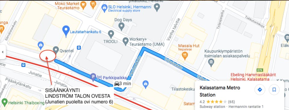 Google Ei Näytä Mistä Tullaan Sisään, Joten Alhaalla Kuvassa On Piirretty Ympyrä Oikean Oven Kohtaan.