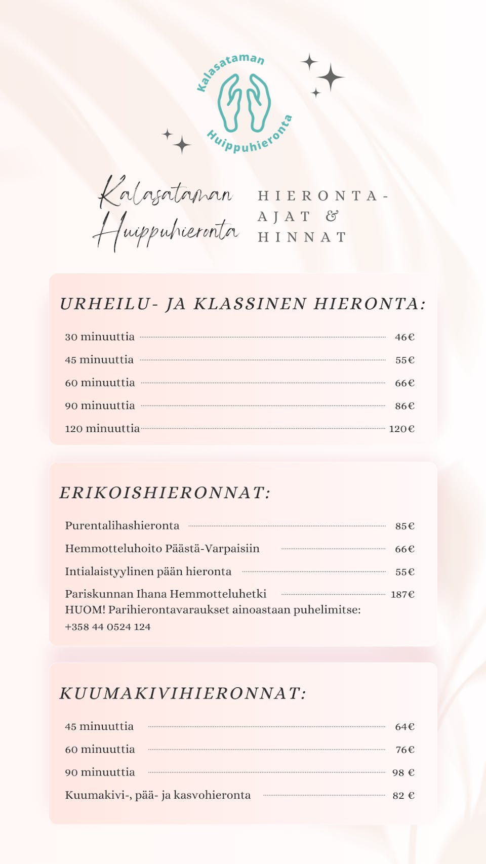 HUOM! Näet hinnat myös kätevästi varauksen yhteydessä.